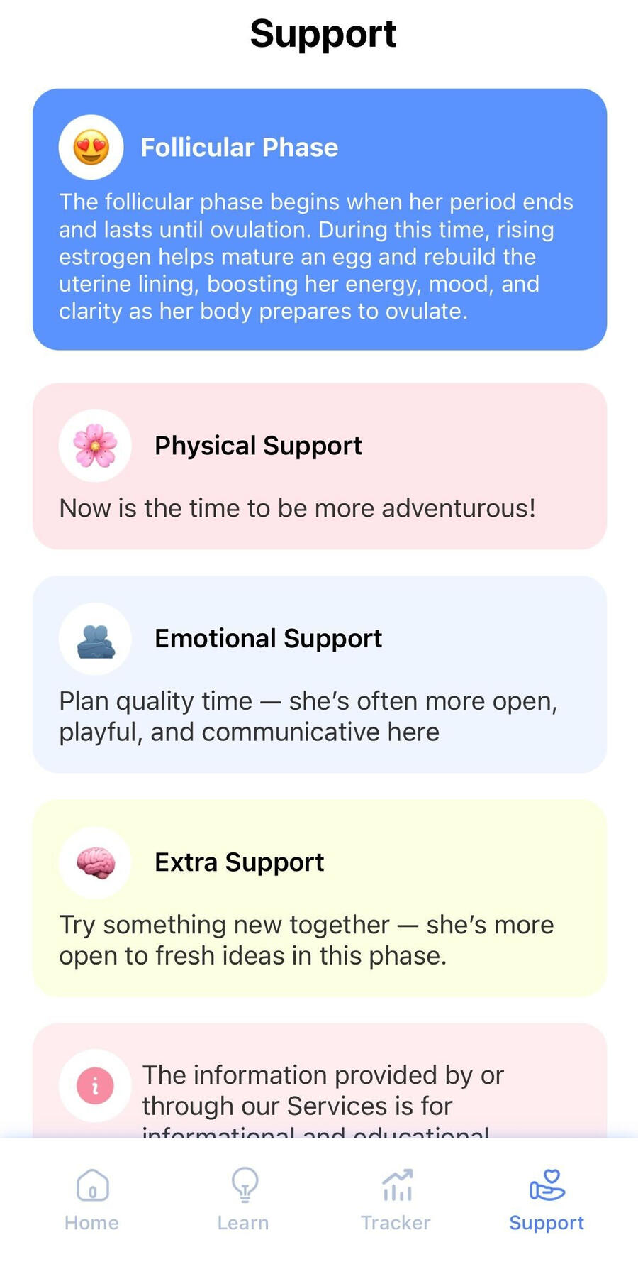 Every phase comes with different needs. Phases gives you practical, phase-based tips on how to support her best. Helping you show up for your partner in ways that matter.